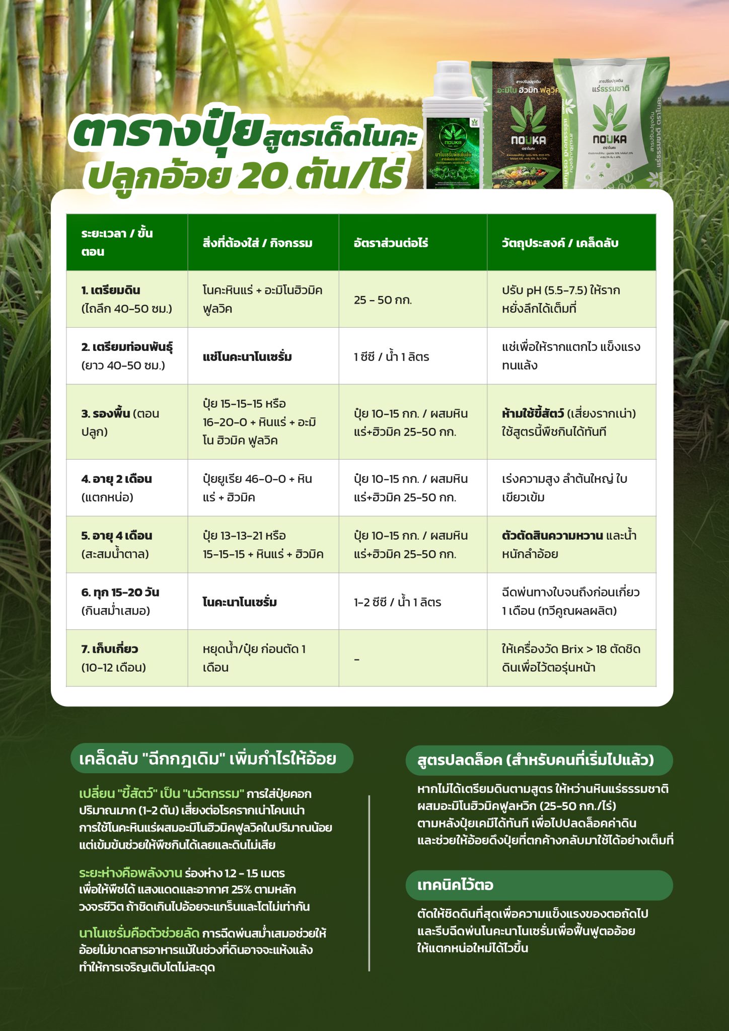 ปุ๋ยเคมีสูตร 15-15-15 หรือ 16-20-0 อัตรา 10-15กิโลต่อไร่ กับโนคะแร่ธรรมชาติซึ่งเป็นอนินทรีย์วัตถุ และโนคะอะมิโนฮิวมิคฟูลวิคหรืออินทรีย์วัตถุ ที่มาแทนปุ๋ยหมักปุ๋ยคอกปุ๋ยขี้ต่าง แต่ปลอดภัยต่อโรค ใช้น้อย เข้มข้น พืชกินได้เลยไม่ต้องรอย่อย อัตรา25-50กิโลต่อไร่ มากน้อยตามค่าpH